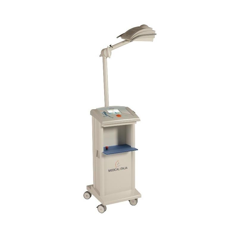 Equipo de terapia por laser con ruedas. Es un generador láser automático de barrido con doble fuente compuesta por 1 diodo IR (940 NM) de 8 Watts y 1 diodo en estado sólido de 650 NM (visible) 3 MW. Cuenta con predisposición para cabezal IR diódico externo. Calcula automaticamente la energía erogada en Julios.